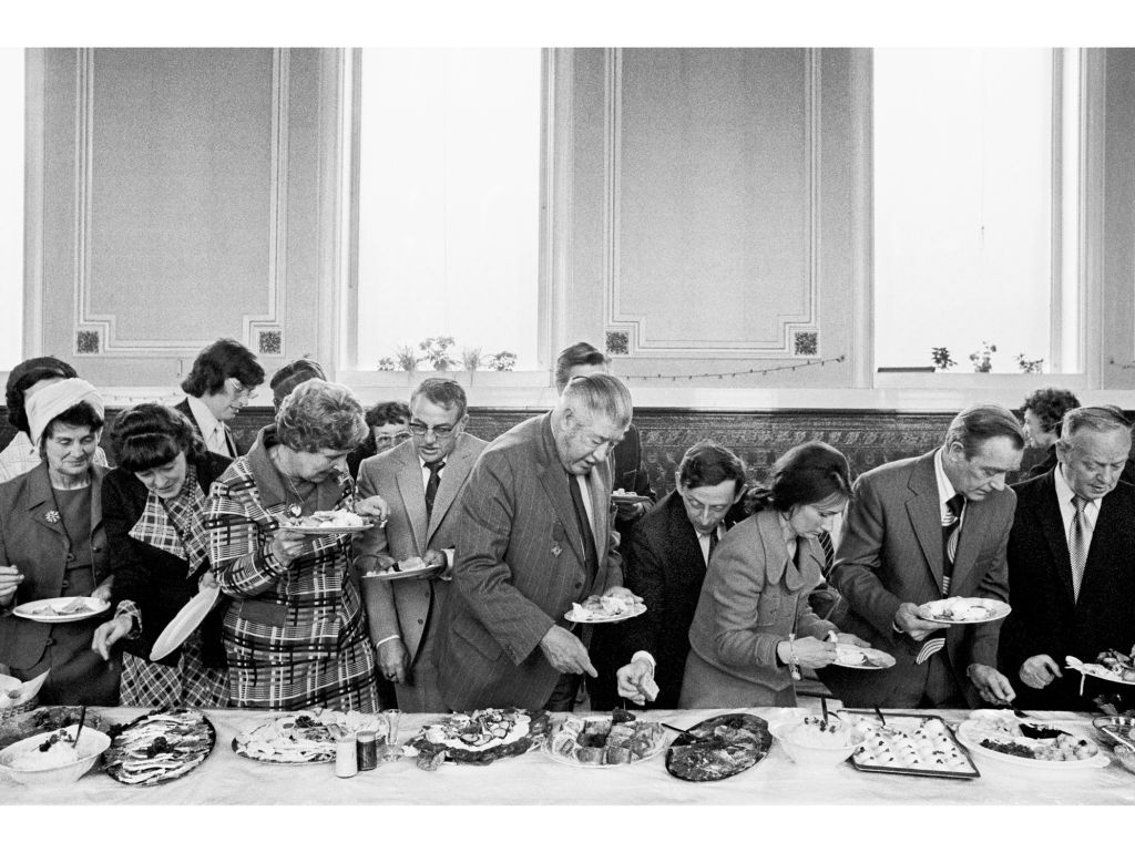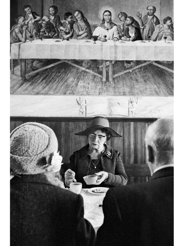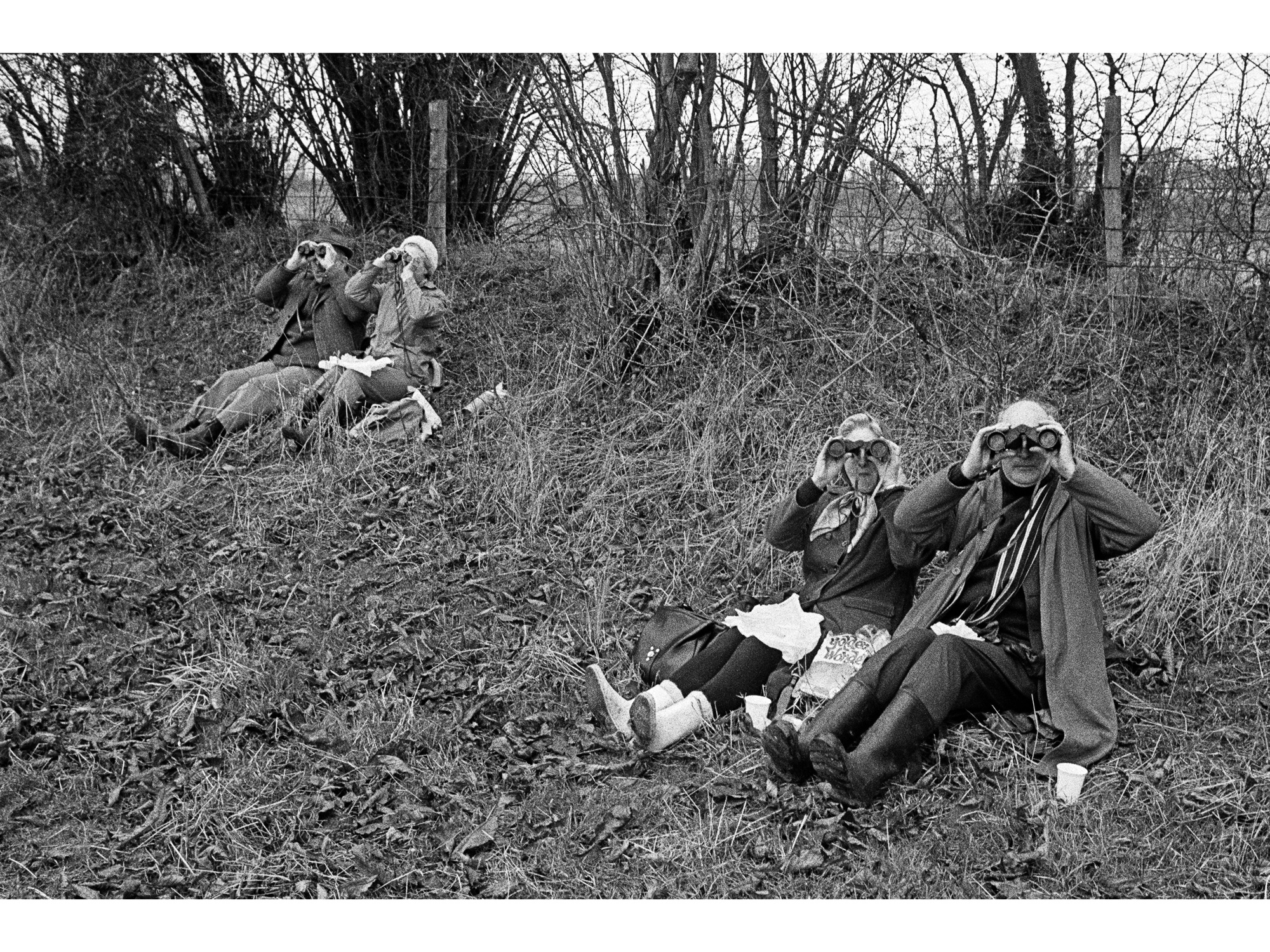 Zu den Höhepunkten zählen Aufnahmen wie Mayor of Todmorden’s Inaugural Banquet (1977), eine Szene am Buffet, in der sich hungrige Gäste dicht an dicht drängen – ein Bild, das zwischen britischer Provinzposse und subtiler Gesellschaftskritik changiert. In Surrey Bird Club (1972) widmen sich zwei Paare mit Ferngläsern der Vogelbeobachtung, während Glastonbury Tor eine Kuh zeigt, die scheinbar als Touristin vor dem berühmten Hügel posiert – eine absurde Umkehrung menschlicher Sehgewohnheiten.