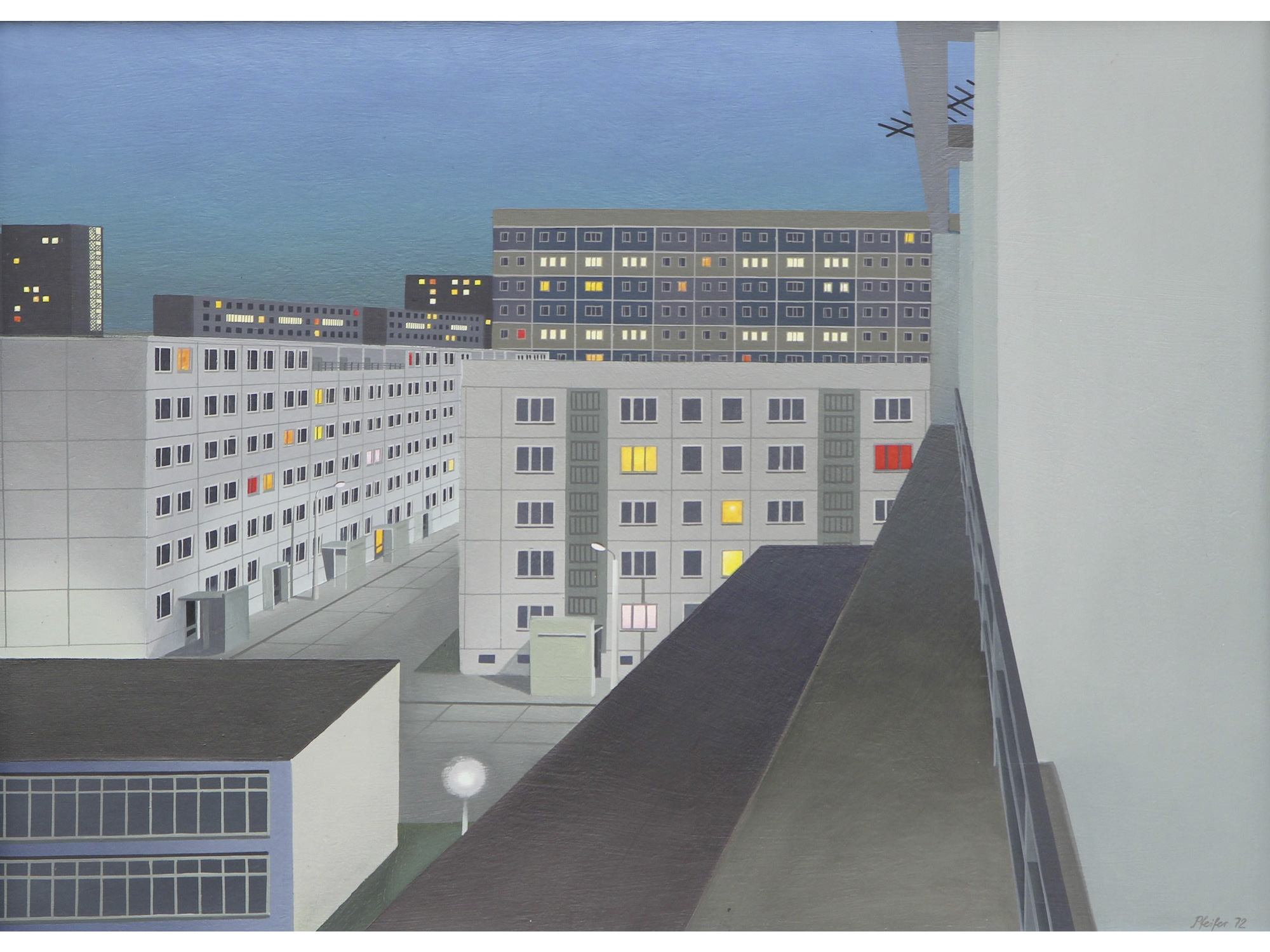 Der Hallenser Maler Uwe Pfeifer hat zwischen 1972 und 1973 gleich sieben Gemälde geschaffen – man könnte sagen: eine protokollarische Annäherung an die Anfänge von Halle-Neustadt. Doch mehr noch: Er hat Stimmungen eingefangen, das Widersprüchliche sichtbar gemacht. Etwa das romantische Sehnen im Bild Morgennebel, verbunden mit dem kühlen Pinselstrich der Neuen Sachlichkeit. Warme, bunte Lichtquadrate leuchten aus einer Quaderwelt, die noch nackt und neu wirkt. Darüber scheint ein Vollmond. Eine Schnur aufgefädelter Ostseesteine – bis heute beliebtes Sammelgut – spricht beredt von Alter, von Naturschönheit, von Rundungen im Kontrast zum allzu profan Kantigen.