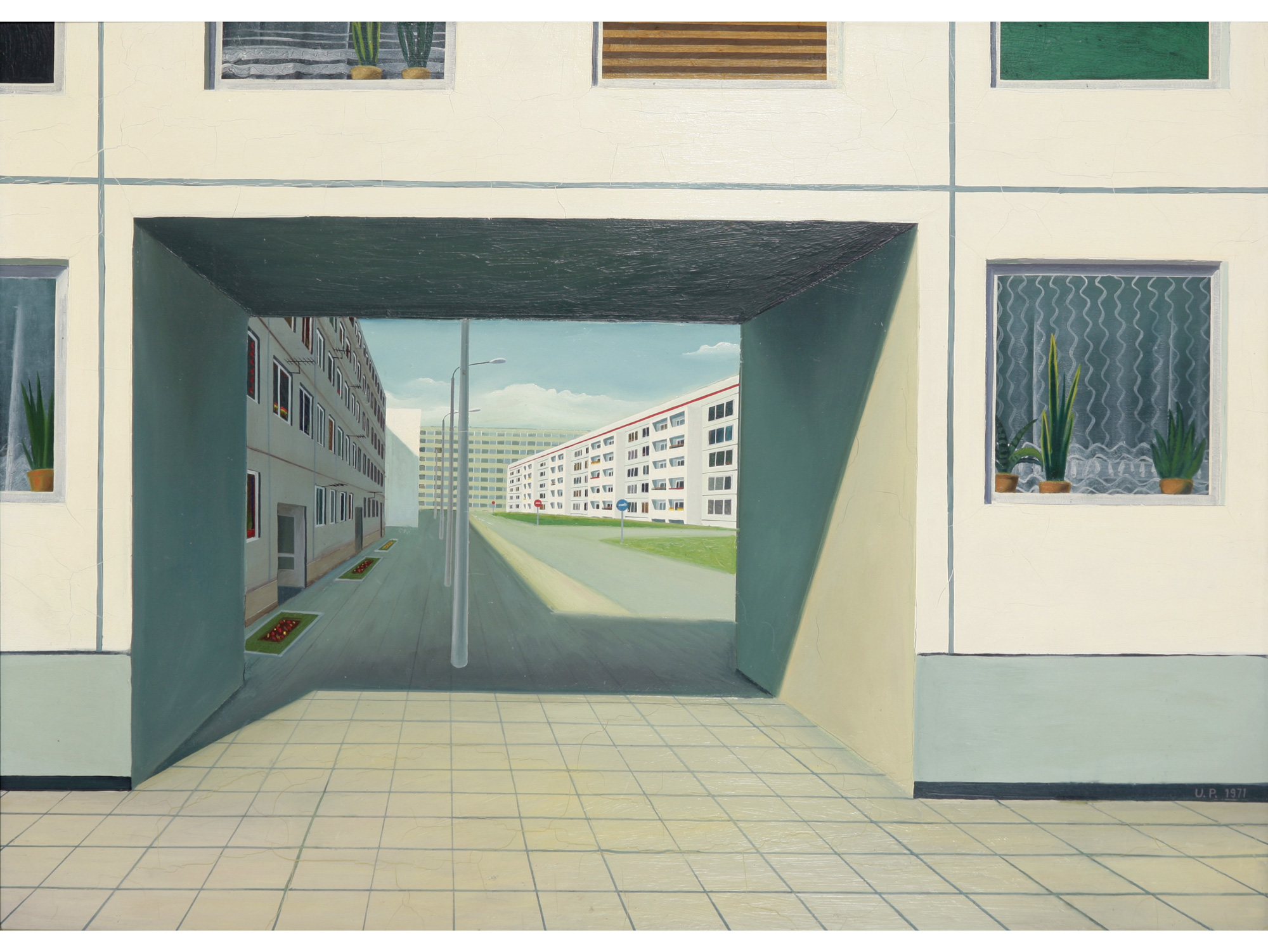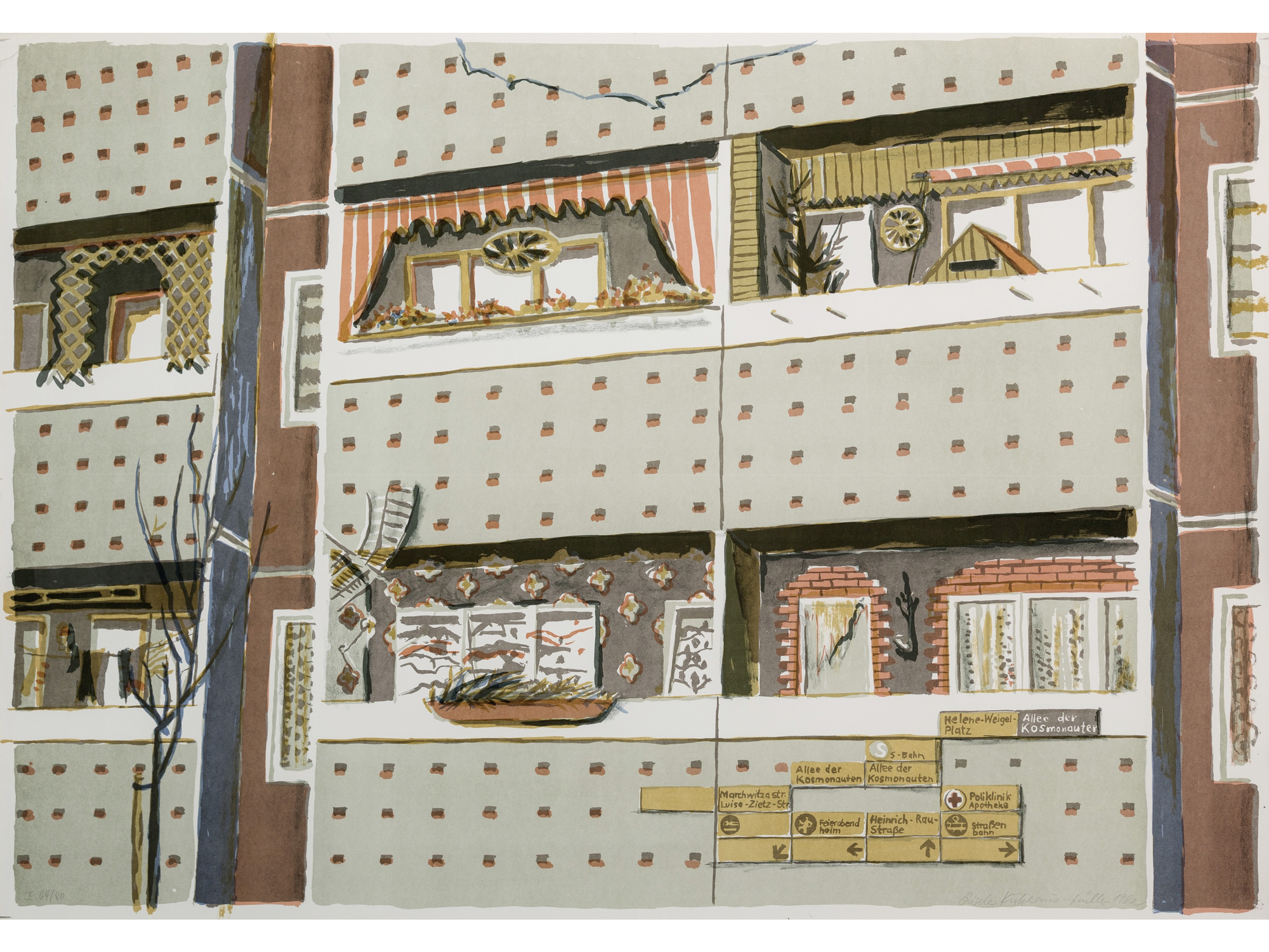 Auch das bereits damals aufrüttelnde Bild mit Menschen, die sich durch eine Unterführung drängen – Rushhour-Feeling pur. Inmitten der Hastenden: eine schöne junge Frau im leuchtend lila Mantel. Wohnen und Wege – auch das gehört zusammen. Und Balkone für alle – ein Novum! Doch in der Realität: ungezählte Raster. Wolfram Ebersbachs Hausfassade, 1974.