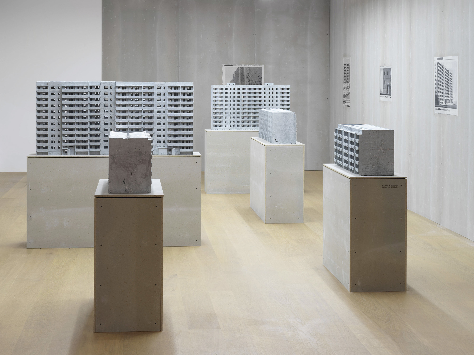 Die Großsiedlungen erfuhren einen tiefgreifenden sozialen Umbruch: Bewohnerwechsel, Entfremdung, Leerstand. Abriss folgte – „Rückbau“ genannt. Viele der einst begehrten Wohnkomplexe wurden in den Neunzigerjahren zu sozialen Brennpunkten. Es kam zu rassistischen Ausschreitungen, etwa in Rostock-Lichtenhagen oder Hoyerswerda. Auch davon erzählt die Ausstellung – etwa mit der seriellen Arbeit „Spaziergang“ des in London lebenden Künstlers Stephen Willats, geb. 1943. Nach eigenem Erleben in Marzahn verknüpft er fiktive Warnzeichen, wie Wegmarken, mit fotografischen Dokumenten – etwa einem Hakenkreuz auf blauem Kreis vor einem Postamt. Oder mit Triangular Stories (2012) von Henrike Neumann, die in zwei Dreiecksformen diametral entgegengesetzte Lebenswelten der Neunzigerjahre nachstellt. Eine davon zeigt: frisch gebackener Gugelhupf, daneben ein Baseballschläger und eine Reichsflagge. Es sind Insignien der sogenannten Baseballschlägerjahre – hier als Requisiten inszeniert, wie sie laut einem Foto in der einstigen Wohnung des rechtsextremen NSU-Trios in Thüringen hätten gefunden werden können.