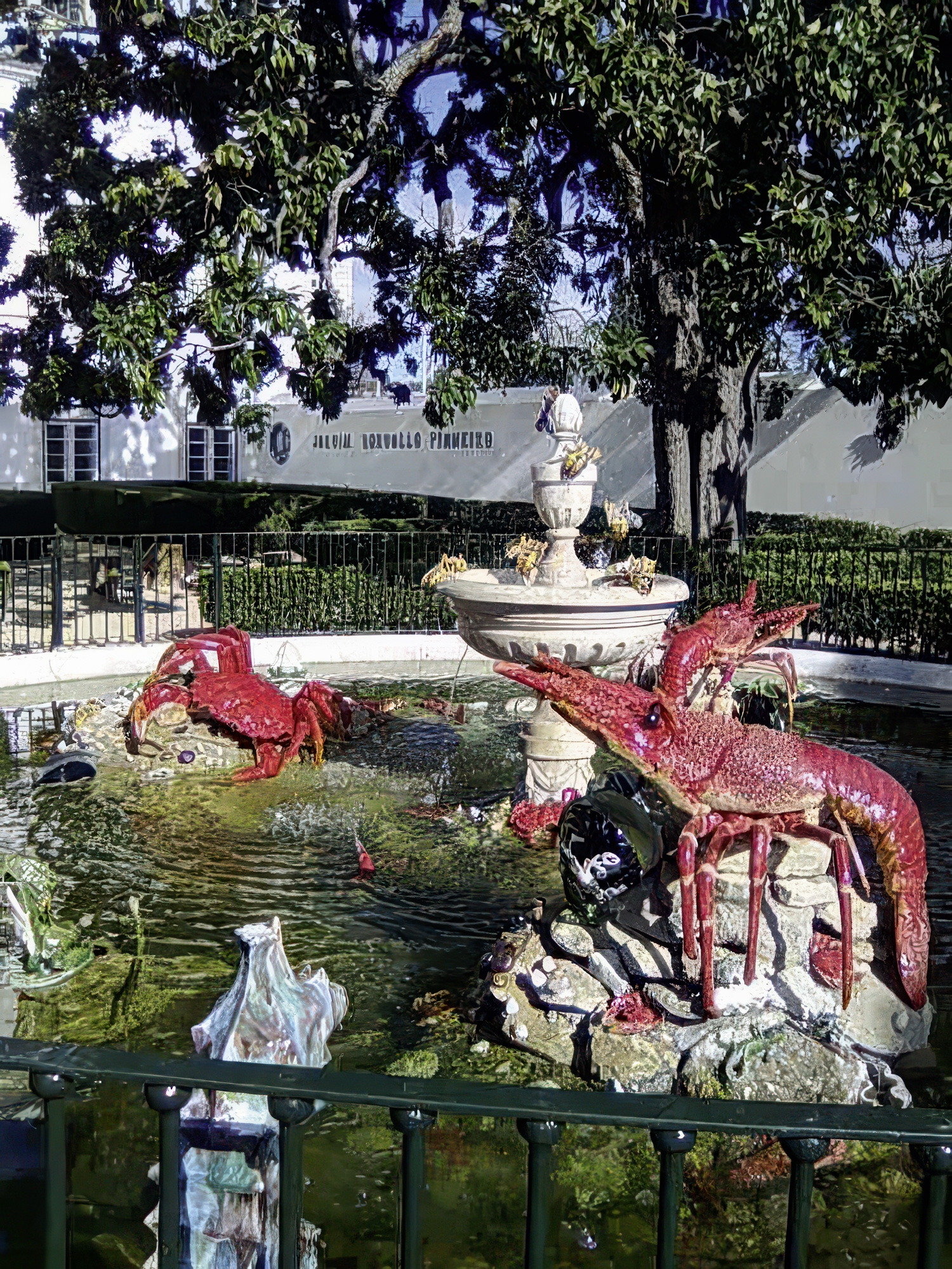 Wer mal eine Pause braucht, kann das im Central, dem ältesten Café der Stadt am Marktplatz, machen, um dann der Route Bordallo Pinheiro zu folgen. Überlebensgroße Menschenfiguren aus dem portugiesischen Alltagsleben auf dem Trottoir, eine Schnecke an einer Hauswand, Pilze auf einer Empore, eine Eidechse am Mauerwerk und vieles andere mehr. Alles Keramik. Die Stadt ist ein Museum unter freiem Himmel. Vor dem Bahnhof auch noch ein Brunnen Bordallo Pinheiros mit einer Schar Frösche.