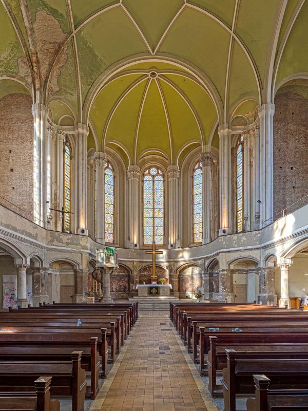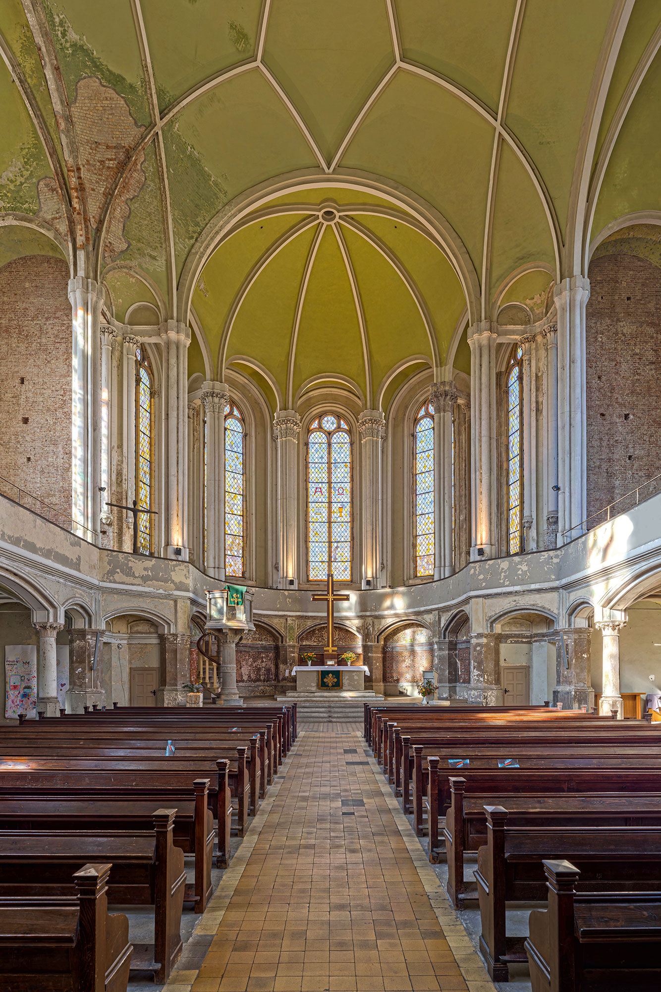 Das gelingt meist durch die Rekonstruktion historischer Gestaltungselemente – manchmal auch in Form von Teilrekonstruktionen. Bei Putz und Stuck bedeutet das oft eine vereinfachte Wiederherstellung von Formen und typischen Details. Im Fall der Zionskirche wurde dieser Ansatz an den Wandflächen durch einen durchscheinenden Farbauftrag in Lasurtechnik umgesetzt. Auch an anderer Stelle wurde gestalterisch Bezug auf historische Elemente genommen – etwa durch einen getupften Farbauftrag an den sogenannten Bündelpfeilern, also den Säulen, die mehrere Rundstäbe bündeln. Die Wandvorlagen sind nämlich alt.