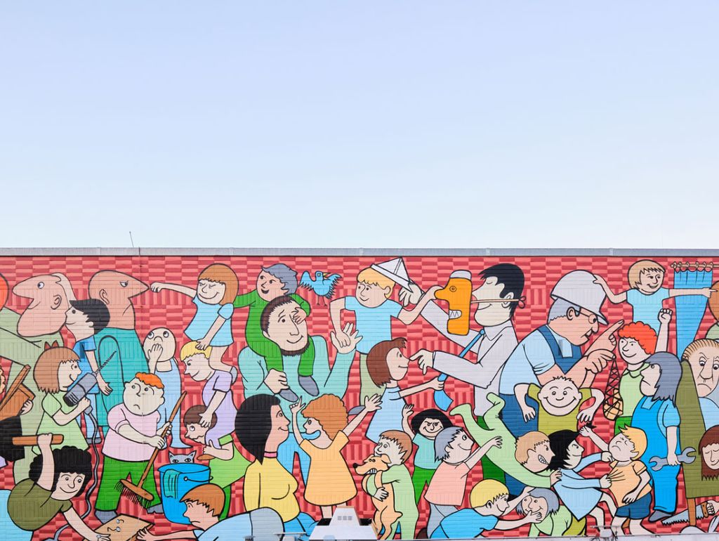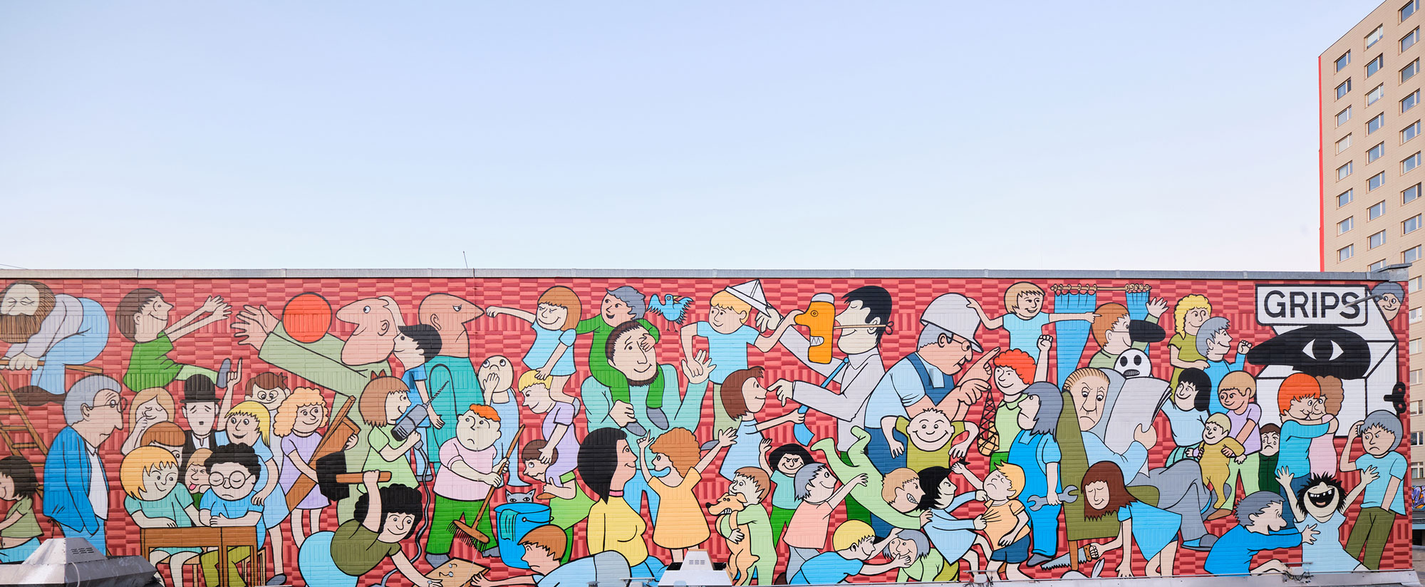 Pünktlich zu Weihnachten hat das GRIPS Theater sein berühmtes Wandbild an der Altonaer Straße im Hansaviertel feierlich eingeweiht. Das 145 Quadratmeter große Kunstwerk des Berliner Zeichners und Karikaturisten Rainer Hachfeld (1939–2024) wurde nach einer aufwendigen Restaurierung wieder in neuem Glanz präsentiert. Seit seiner Entstehung im Jahr 1974 ist das farbenfrohe Bild nicht nur das Wahrzeichen des weltbekannten Kindertheaters, sondern auch ein prägnantes Merkmal des Hansaviertels.